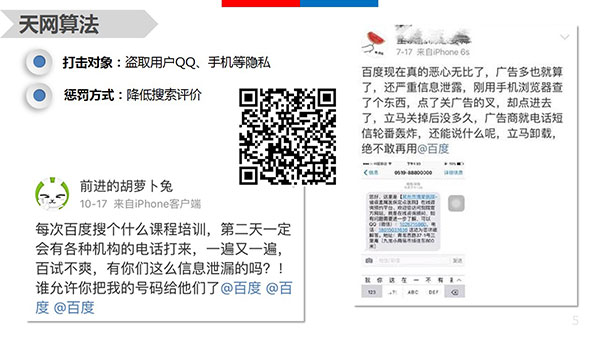 部分站點為盜取用戶信息,在網頁嵌惡意代碼,用于盜取網民的QQ號、手機號。致使許多網民誤認為這是百度所為。為此,百度網頁搜索和百度安全聯合研發天網算法,針對這種惡意行為進行打擊。