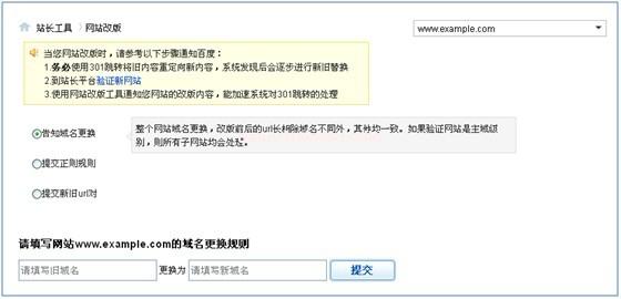 如果網站的改版比較復雜,比如目錄級別大量鏈接進行跳轉,可通過“提交正則規則”或“提交url對”向百度提交改版規則。