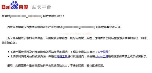 從昨天開始,百度站長平臺使用網頁搜索反作弊團隊每天產出的數據,通過站點消息、郵件和短信對相關站長進行提醒。如果您收到提醒,說明網站已被黑客非法入侵并添加了大量垃圾內容,傷害了用戶的搜索體驗,請及時修復漏洞,避免降低網站在百度搜索引擎的評價,避免流量損失。