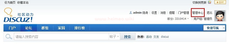 步驟二:用管理員賬號登陸Discuz平臺環境,進入管理中心。如下圖: