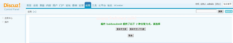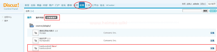 步驟三:進入管理中心“應用”頁面,點擊“安裝新插件”選項,選擇“baidusubmit”插件并安裝。如下圖: