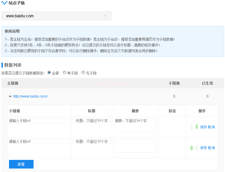 3、支持對子鏈的排序和編輯:支持對已提交的子鏈進行標題、摘要的修改及刪除操作;并可對提交的子鏈進行排序,百度將會根據排序和用戶需求確定最終的展現順序。