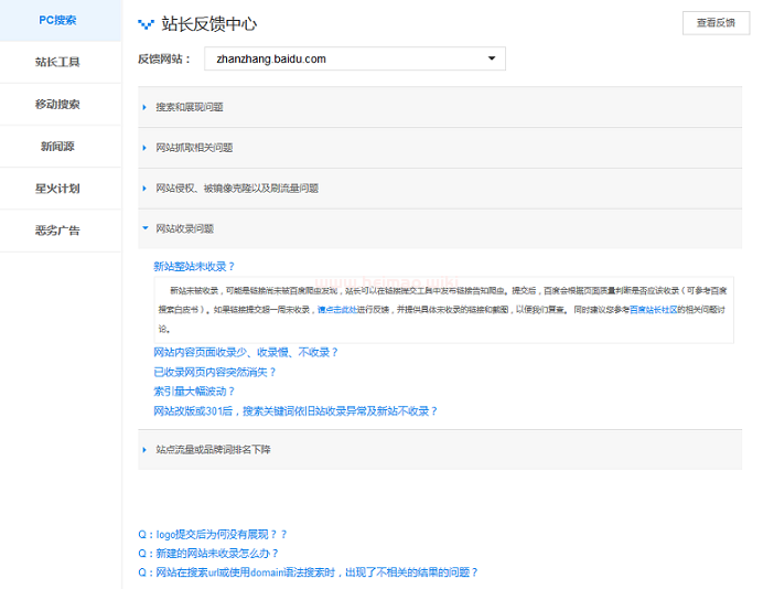 1、反饋入口精細化,在PC搜索分類中,由原來的7個簡單分類,細化為5大類、20小類反饋入口,站長可根據自己的具體問題進行分類反饋,問題定位更精準,解決問題更順暢。